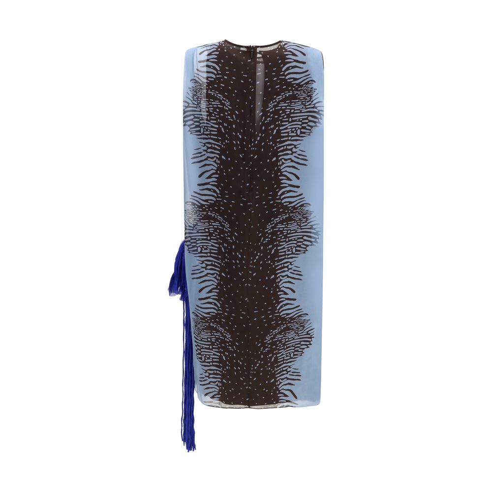The flower-detail Dress by Ferragamo is a sophisticated reinterpretation of the sleeveless sheath dress, crafted from pure silk with a contrasting animal-print pattern. The design features an underlying slip dress that creates an elegant layered effect, enhancing the fabric’s lightness and fluidity. A maxi flower intarsia stands out on the left side, with shaped petals and long tubular pistils forming a rich, dramatic fringe. A striking piece, ideal for special occasions.