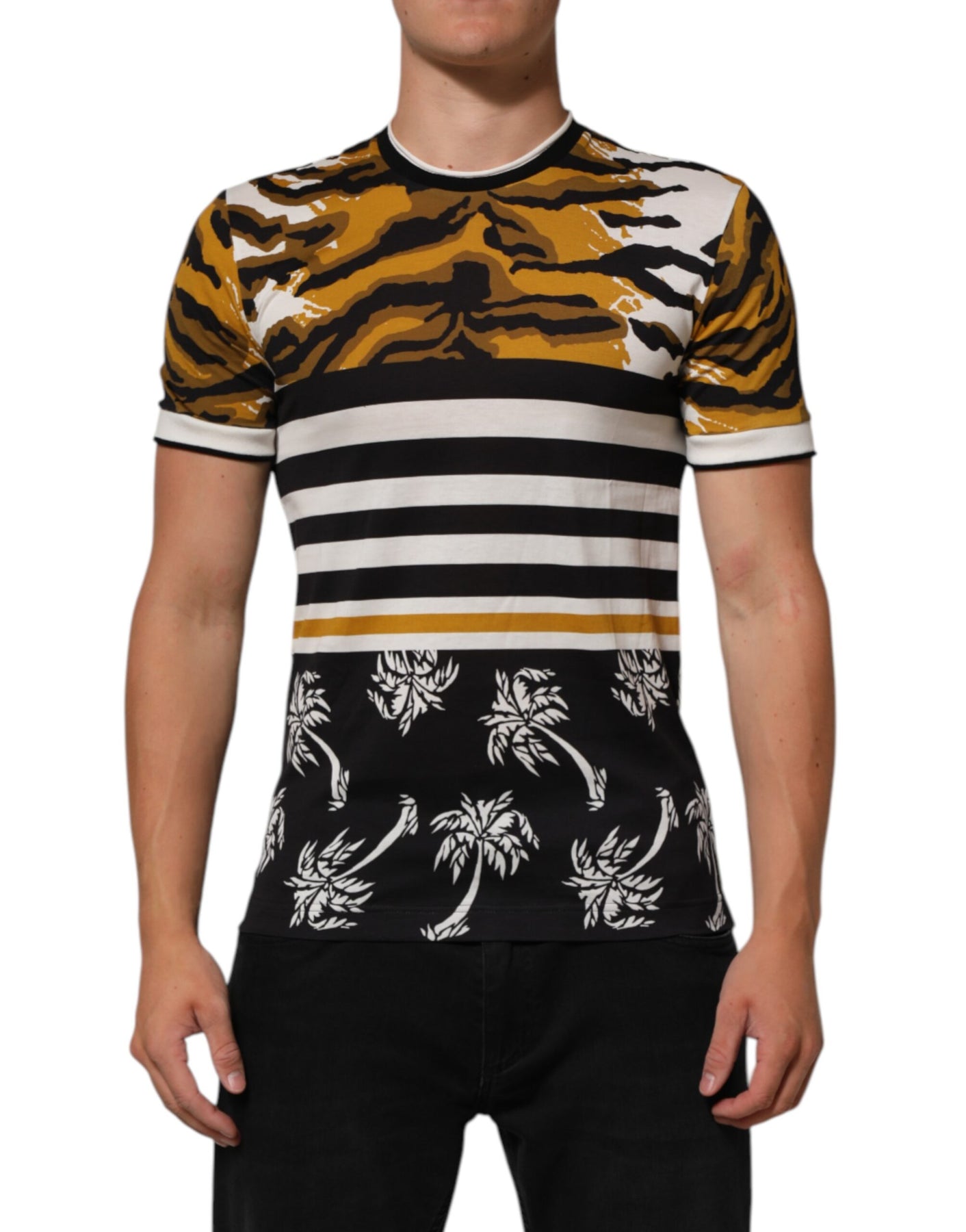 Dolce & Gabbana Multicolor Leopard Palm Leaf Men Crew Neck T-shirt
